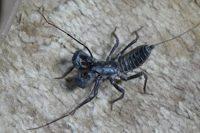 When Mac was visiting he wanted to photograph a vinegaroon so bad and we couldn't find one. Today after I watered at the oasis and did some patching in the stucco tank, I came to town. I was just sitting in a chair, watching TV, minding my own business, when I spotted a huge vinegaroon 2" from my foot.