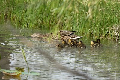 A while ago I went to our ponds here in town to see if all four ducklings were still there. I didn't see them, but did flush several wild Mexican Ducks. Still looking, I walked around the perimeter of the ponds. When I got to the south side of the east pond I accidentally flushed the four, yes still four, babies. I guess they had been in the grass at the edge of the pond, not sure. But they tore out squawking across the pond like lightning, frantically flapping their wings as they skimmed the water's surface. The mother was in the middle of the pond totally unperturbed. They didn't slow down until they approached the safety of the willow tree hanging over the water. So cute to see!