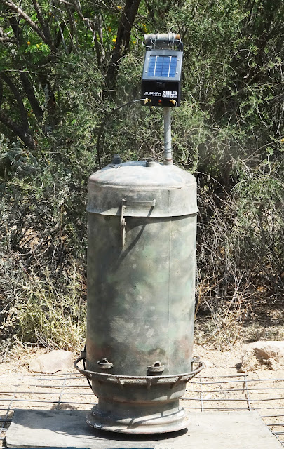 Texas Parks & Wildlife came out and helped us install a solar electric unit. It's not as powerful as an electric jolt from the grid, but still supposedly does the trick. We shall see. The rubber mat the TP&W helper is standing on is to keep birds from getting shocked. The current will only work if you stand on the wire and touch the feeder at the same time. Humans would have to do it barefoot to get a mild shock.